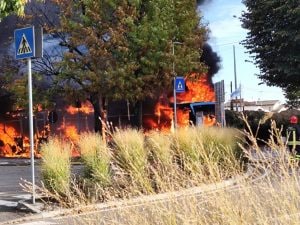 Autobus con 15 giovani a bordo prende fuoco a Castrezzato: l’autista se ne accorge e mette in salvo tutti