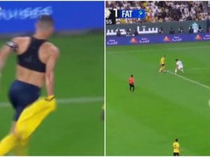 Cristiano Ronaldo ha capito subito di aver fatto qualcosa di mostruoso e ha festeggiato in maniera adeguata: il 40enne campione portoghese è impazzito di gioia, si è tolto la maglia e l'ha lanciata ai tifosi in tribuna.