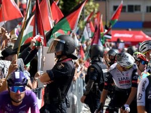 I manifestanti nelle frequenze radio della Vuelta, parte una canzone: “Lunga vita alla Palestina”