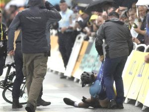 Tifoso in bici sul traguardo, la goliardata al Tour finisce malissimo: la polizia lo schianta a terra