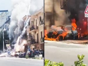 Incendio in un negozio di fuochi d’artificio a Sezze, fiamme e fumo contro un palazzo