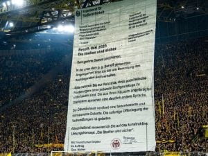 In Germania la politica sta cercando di cambiare una serie di norme per il tifo organizzato. I tifosi del Borussia Dortmund hanno protestato in modo vigoroso esponendo un mega striscione durante una partita di coppa.